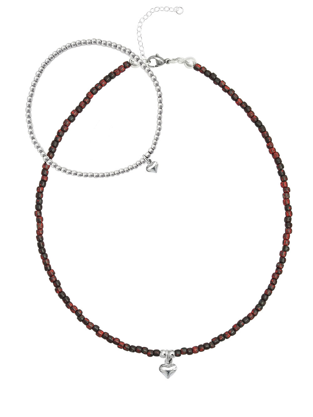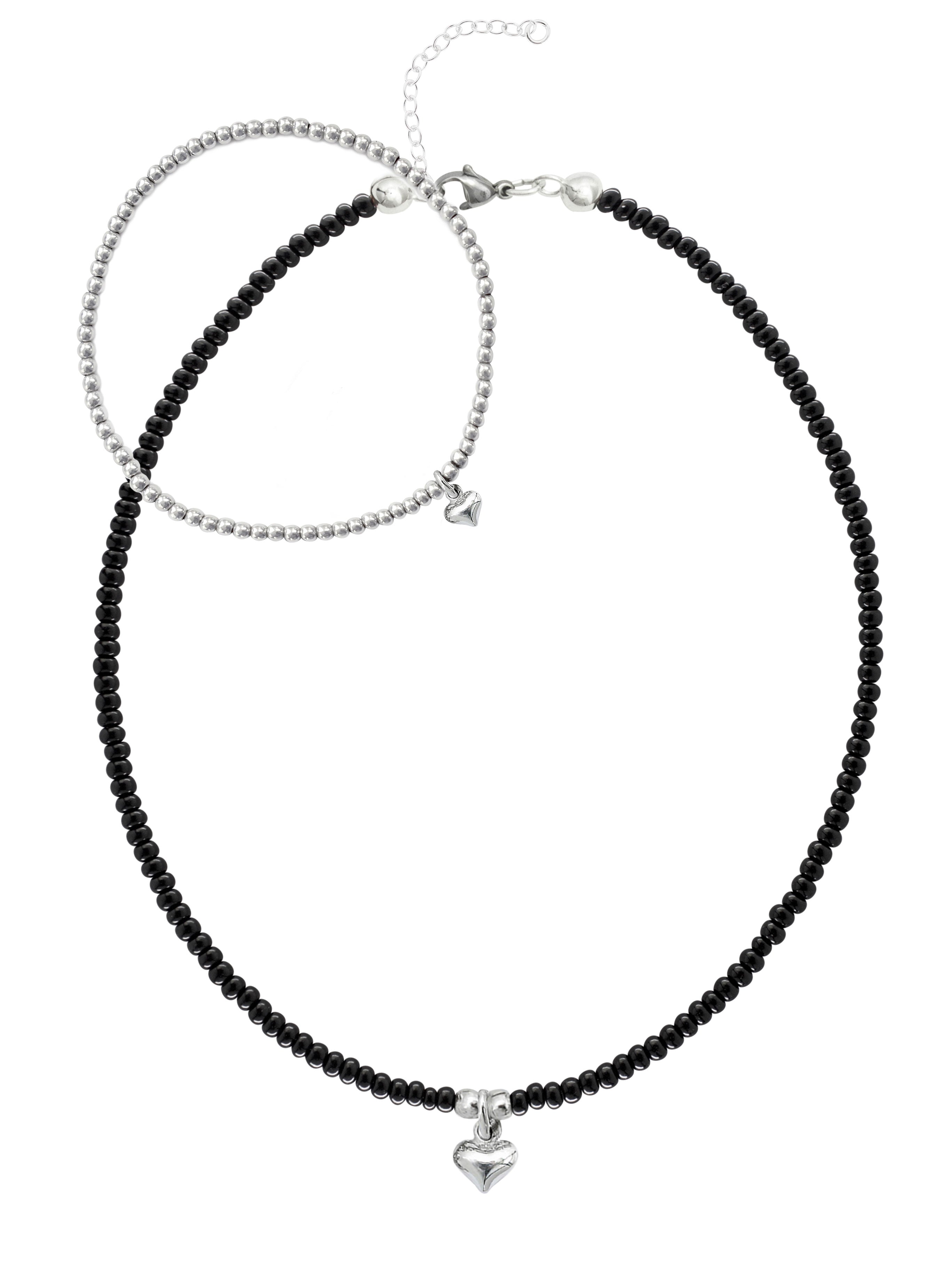 Chain necklace with glass beads with 925 silver heart pendant and 925 silver ball bracelet with heart