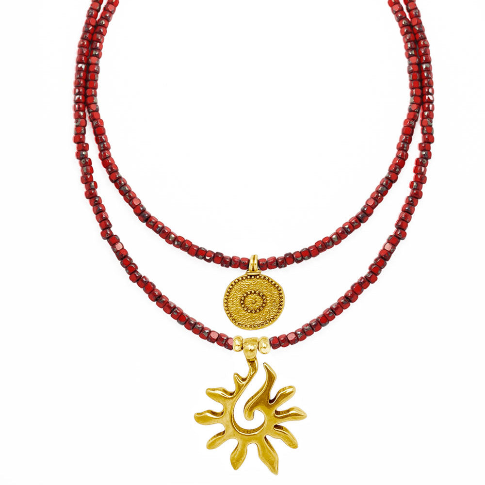 Necklace Jewelry Set with red galsbeads and Sun Pendant