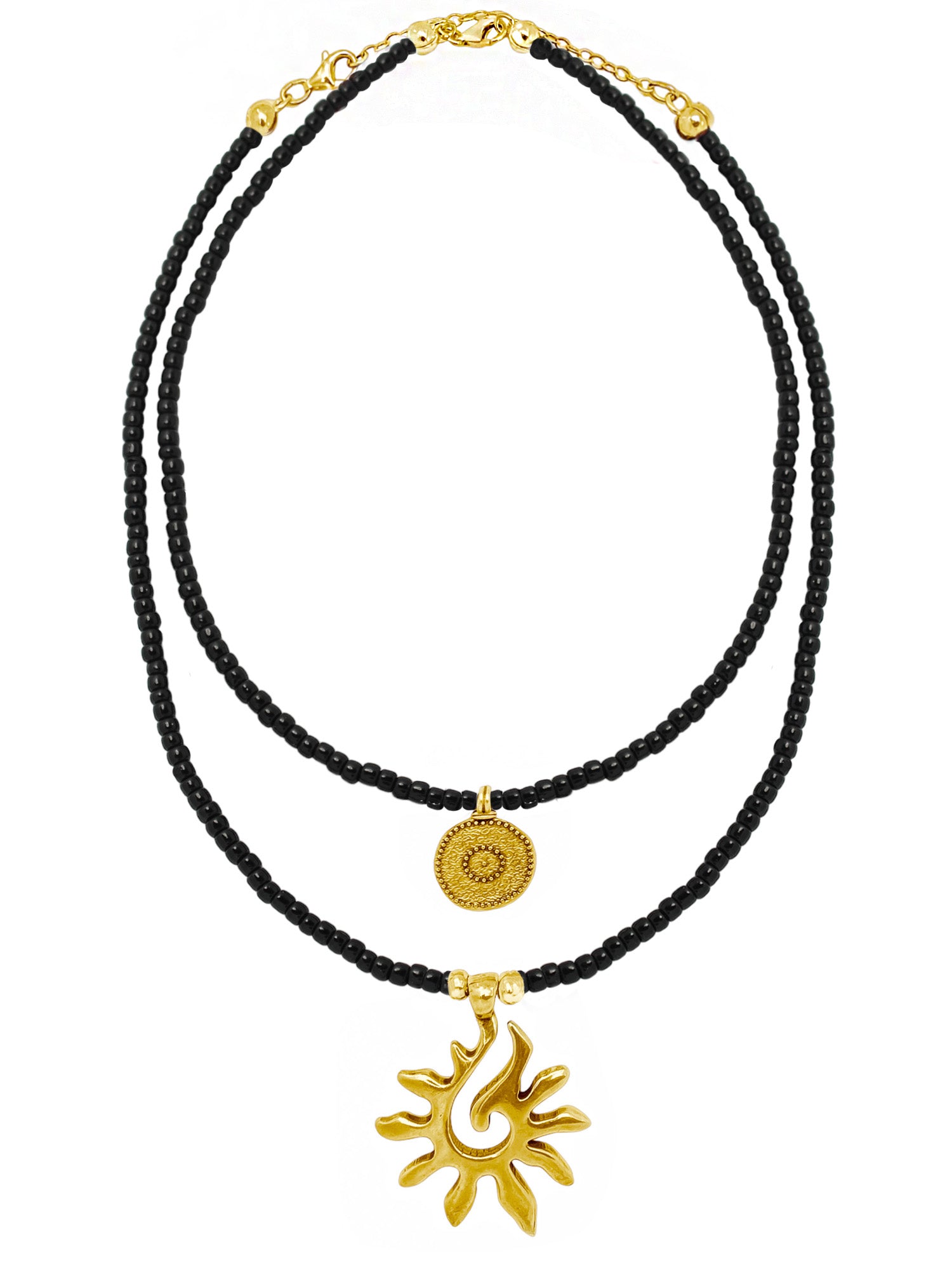 2 necklaces for women with attached small glass beads and filigree coin pendant and sun pendant